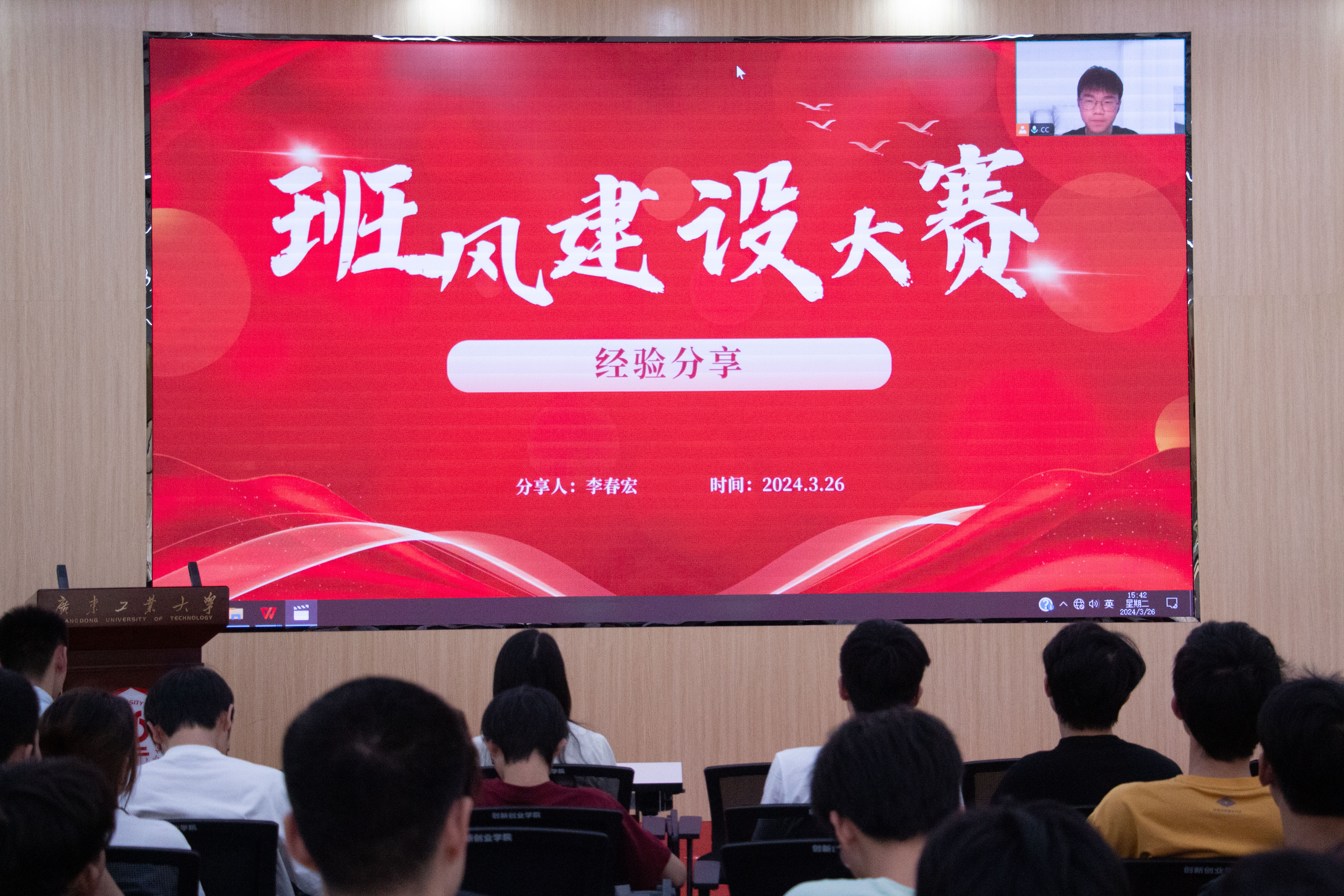 蔡健老师根据自身多年的工作的经验,结合具体事例,从不同角度向同学们阐述他对于如何做一名合格的班干部的看法与建议。他强调,作为班干部要在思想上做精神建设的引领者,在学习上做学风建设的带头人,在生活上做关爱同学的服务者,在工作上做团结同学的建设者。李春宏同学通过视频分享了自己参加上一届班风建设大赛的经历,展示了当时参赛的PPT以及备赛经验,并提出了一些实用的建议,助力同学们在班风建设大赛中取得佳绩。