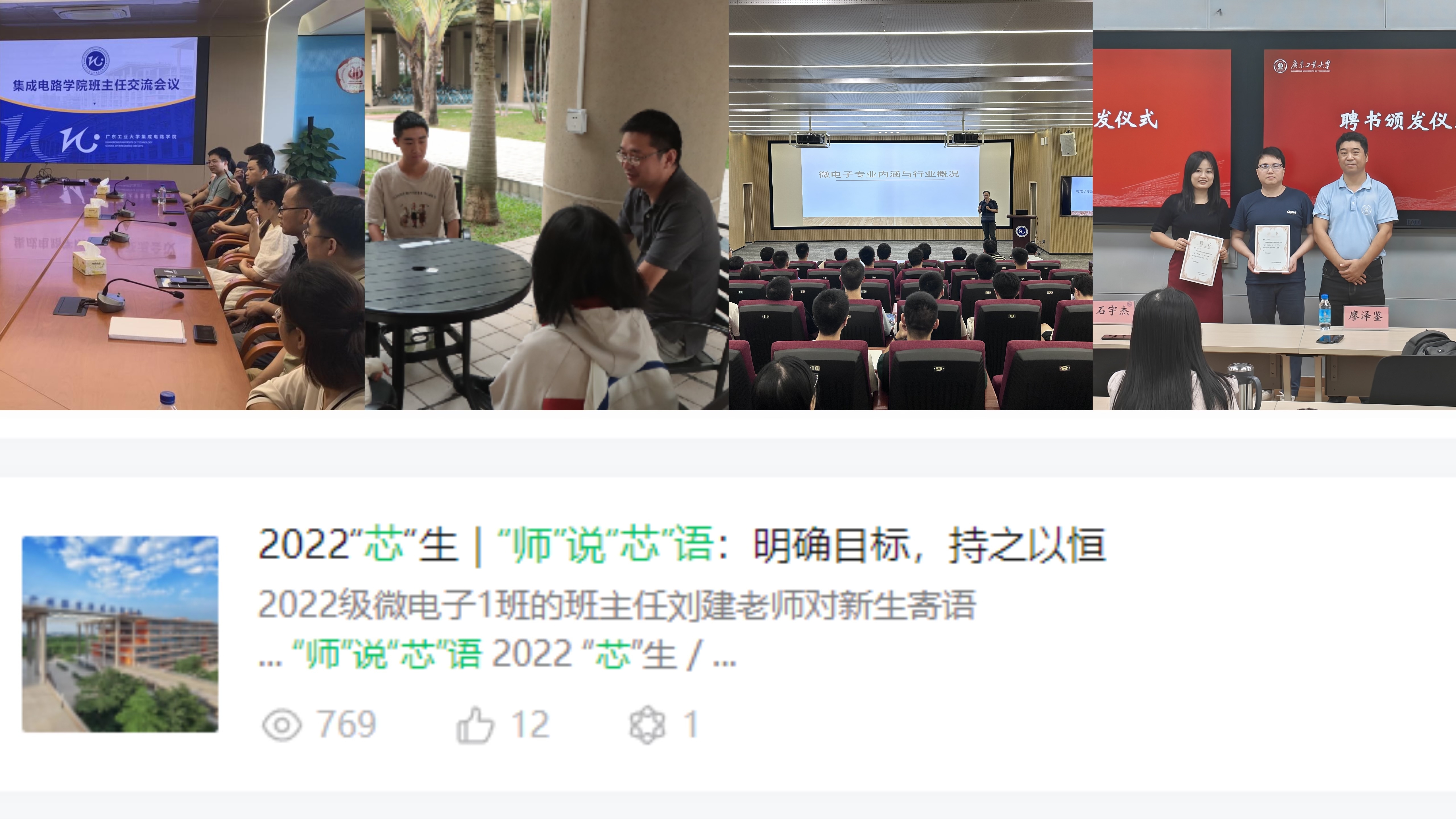 学院扎实推进“学业-科研”双导师制度,形成“学院领导-辅导员-学业导师(班主任)-科研导师-学生家长”育人合力,每学期定期开展班导师座谈会,动态交流班级、年级学生学习情况,群策群力筑牢学院学风基石;邀请系主任给新生讲授“专业第一课”,引导学生做好大学规划和优化学习方法,扣好专业教育的第一粒扣子;在公众号上开设“师说‘芯’语”专栏,分享专业教师和班主任老师寄语,架设教师和学生沟通的桥梁;完善校友信息库,发挥校友帮扶作用,聘任杰出校友担任学生发展导师,开展精准职业生涯规划指导。