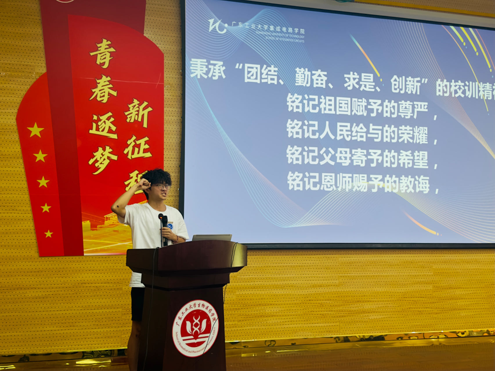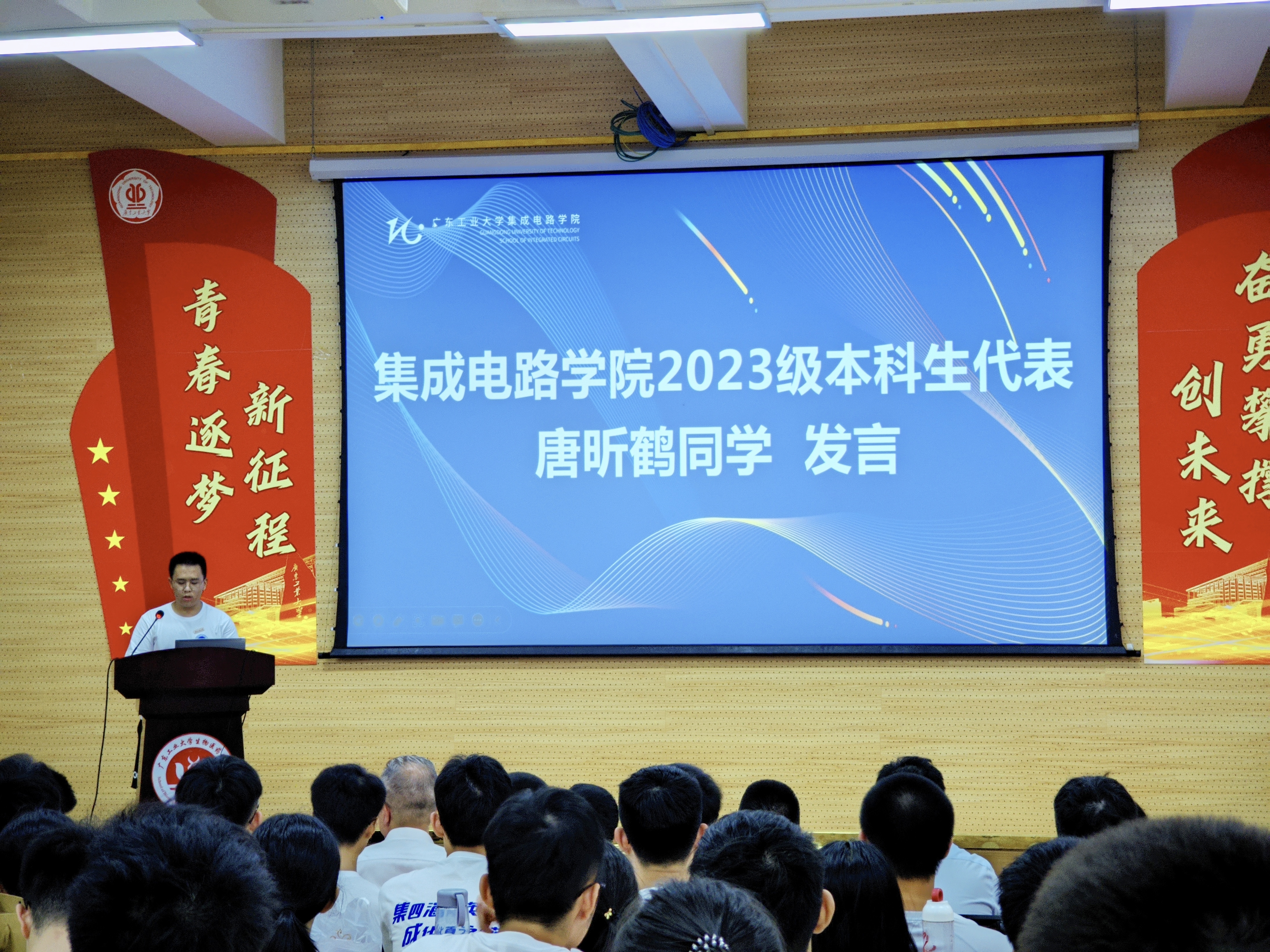 唐昕鹤同学作为本科生新生代表,分享了他初入广工的感想以及对自己成长的要求。最后,他表达了对学院未来的憧憬和学院精心安排新生入学教育计划的感谢。