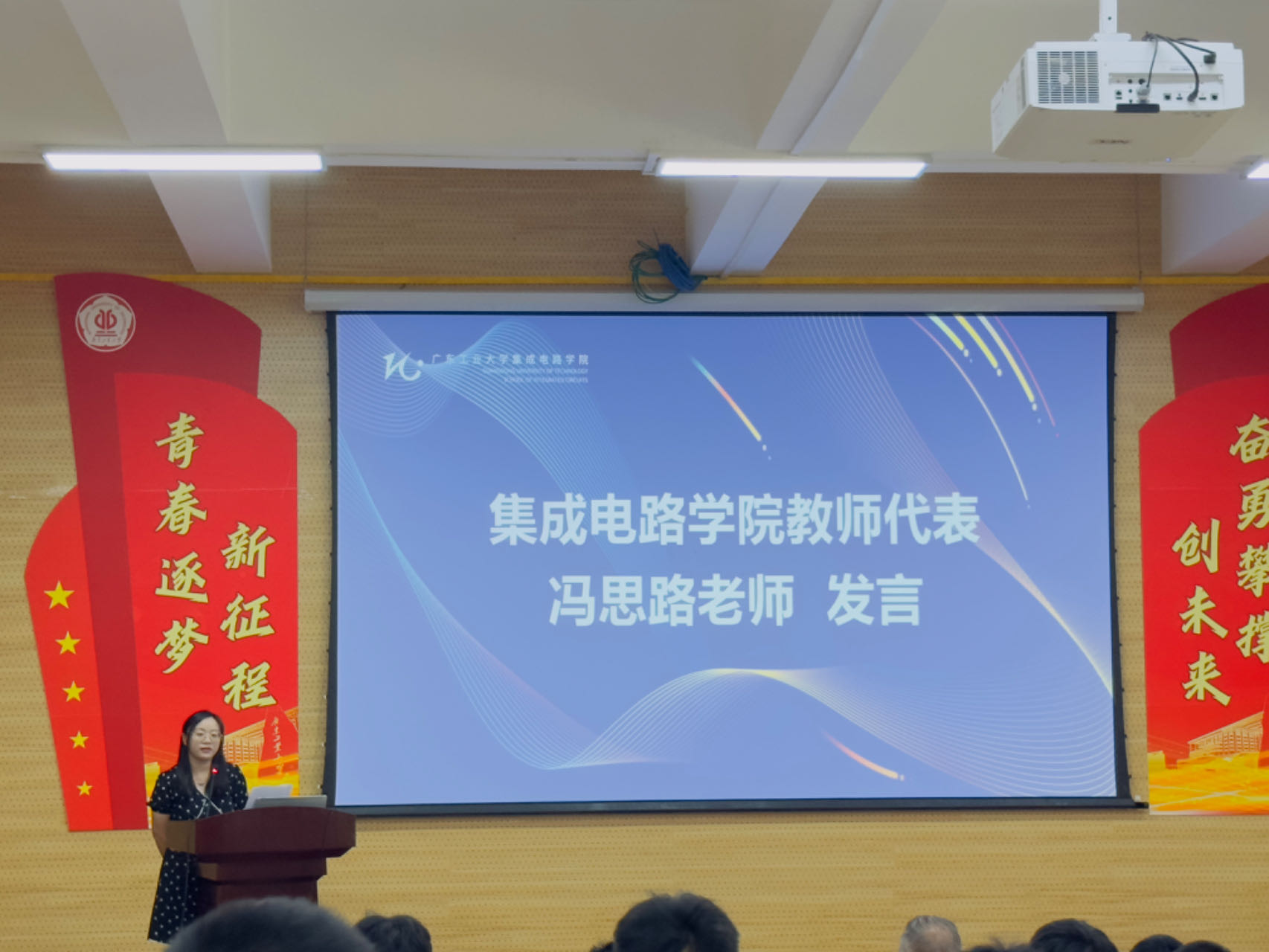 2023级微电二班班导师冯思路老师作为班导师代表发言。她向新生提出了三点期许:一是要不畏险阻,破时代之浪,发扬“自讨苦吃”的精神;二是要无私奉献,乘时代之浪,培养“坐冷板凳”的耐性;三是要勇于拼搏,造时代之浪,书写“奋斗青春”的画卷。
