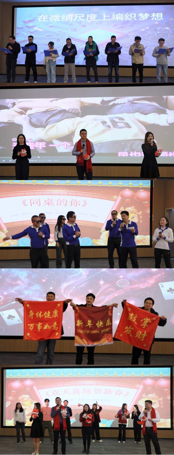 最后,学院教师全员参与了迎春联欢活动,联欢会现场处处洋溢着喜庆的氛围,各位老师献上的文艺表演环节更加精彩纷呈:《同桌的你》《在微纳尺度上编织梦想》《朋友》《魔力四射》《如愿》《欢天喜地贺新春》。教师们一展歌喉,用悠扬旋律表达了平凡中的坚持与希望;朗诵铿锵有力,回顾拼搏征程的同时,凝聚逐梦前行的力量;魔术神秘玄妙,引燃现场氛围;舞蹈活力四射,饱含奋进的热情。现场掌声不断,喝彩连连,大家纷纷合影留念,定格团聚的喜悦,并表示在新的一年里,将群策群力、团结协作、与时俱进、奋发向上,共同为学院的发展贡献自己的力量。联欢会由集成系杜志侠老师和微纳系楚春双两位老师精彩主持。