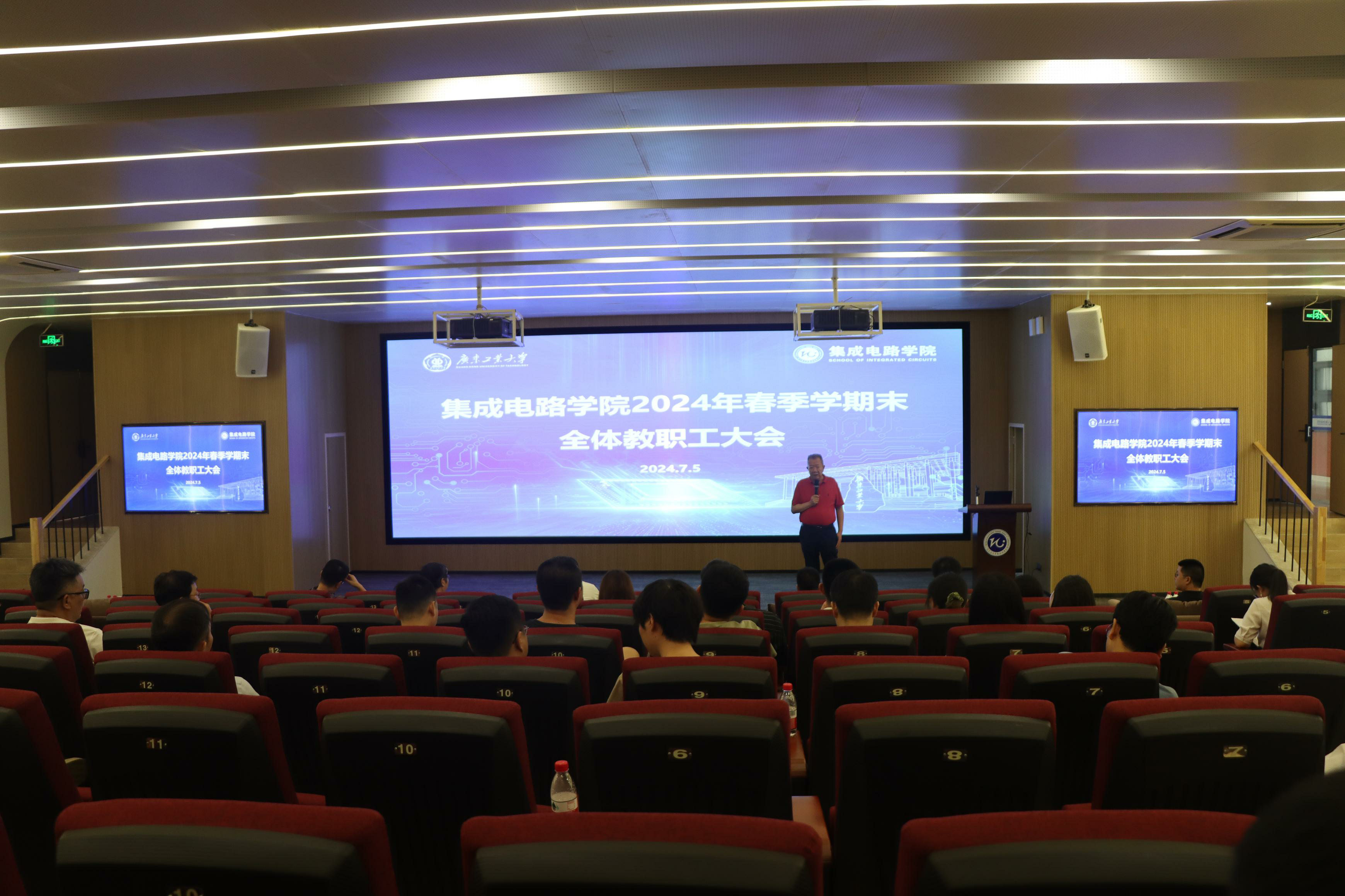 在理学馆学术报告厅召开学期末全体教职工大会,传达学校有关通知要求,部署暑期安全及重点工作。会议由学院党委书记沈彬主持,全体教职工参加了会议。