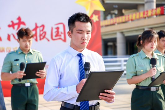 6名退役复员学生为全体师生带来朗诵《强芯报国 领航奋斗》,以昂扬的姿态,铿锵的语气,向全体师生展现集成青年“强国必须强军,强国更要强芯“的远大志向,发出“请党放心,强国有我”的时代号召。