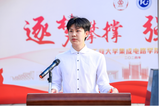 2023届毕业生吴浩杰同学代表全体毕业生发言,他号召全体毕业生面对“芯片卡脖子”等技术难题,勇于担当,敢于创新,努力成为国家发展的中坚力量,在实现中华民族伟大复兴的中国梦中,书写属于自己的精彩篇章。