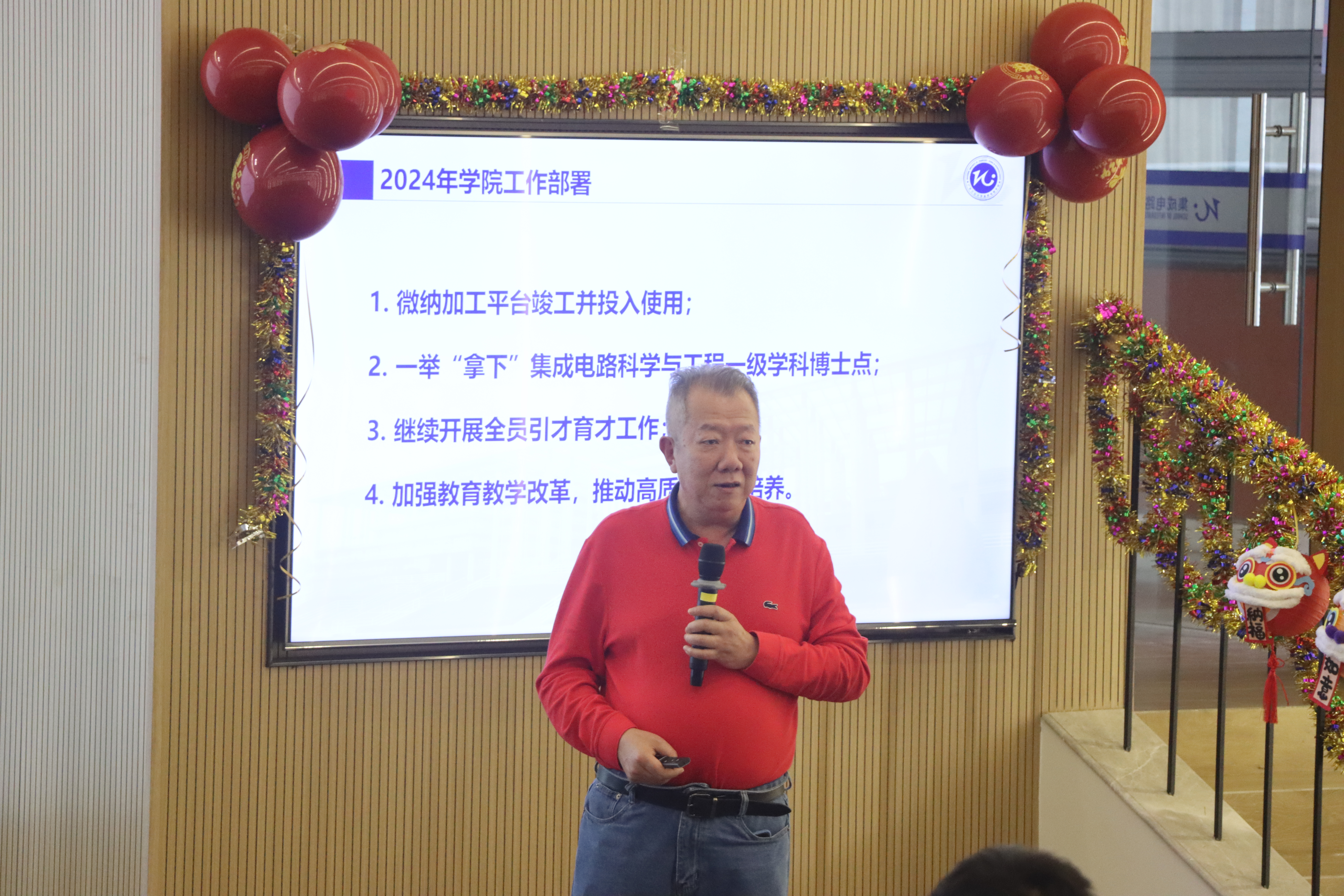 十件发展大事”解读,与参会教工重温了学院在主题教育、学科平台建设、人才培养、科研成果、学院建设、校友工作等方面开展的工作及取得的成果,并对2024年学院重点工作进行部署。