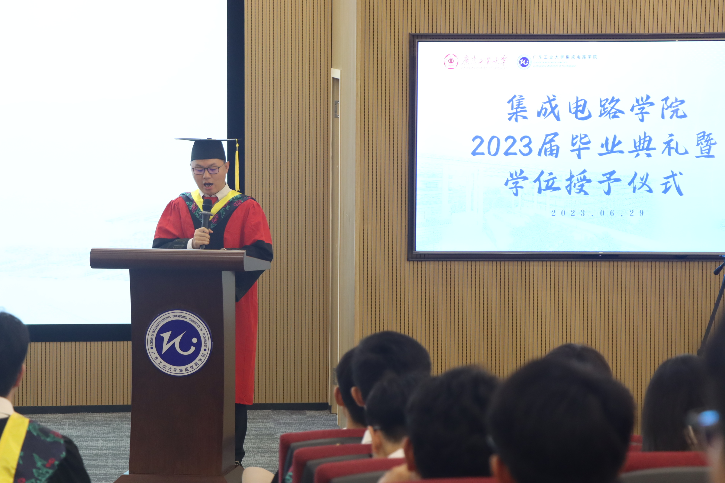 凤凰花开日,启航追光时。2023年6月29日上午,集成电路学院2023届毕业典礼暨学位授予仪式在理学馆学术报告厅隆重举行,院长熊晓明,院党委书记沈彬、副书记石宇杰,副院长蔡述庭、刘远,微纳电子学系教授魏爱香,集成电路工程系教师代表符哲,校友代表周仲良,全体班导师,各年级辅导员以及2023届全体毕业生出席本次毕业典礼暨学位授予仪式。典礼由学院副院长刘振主持。
