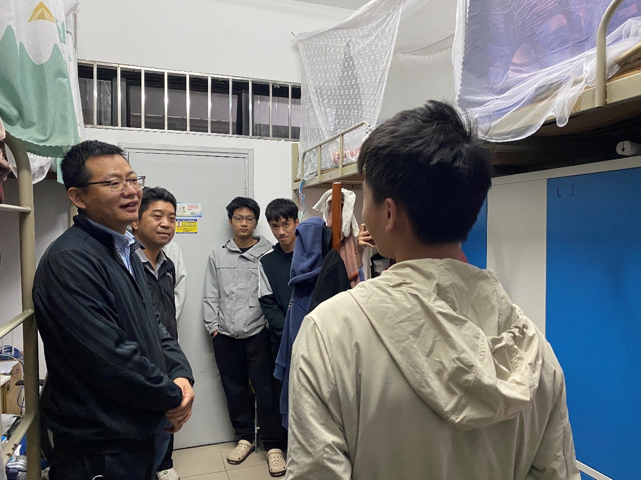 学院党委书记沈彬、副书记石宇杰以及全体辅导员深入学生宿舍,了解学生离校返乡情况,以及在学习和生活中遇到的困难。沈彬书记认真聆听同学们的返乡计划,提醒同学们在返乡之前做好和当地社区的沟通和联系,配合社区做好防疫工作,在回家的路途中做好防疫措施。临近期末考试,部分同学出现了一些焦虑不安的情绪,他分享了自己的学习经历和调适情绪的方法,不时叮嘱同学们调整好自身的心理状态,应对一切困难和挑战。石宇杰副书记提醒同学们要注意用电安全,做好防寒保暖工作,应对本次寒潮,并鼓励同学们大胆向学院提意见,助力学院的建设。