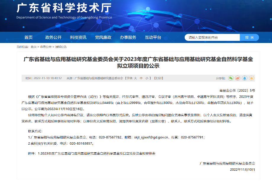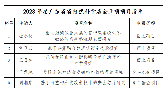 近日,广东省科学技术厅公布了关于2023年度广东省基础与应用基础研究基金自然科学基金拟立项项目公示,high漫画 共获批立项广东省自然科学基金5项,立项经费50万元,其中面上项目3项,青年基金项目2项。立项名单如下: