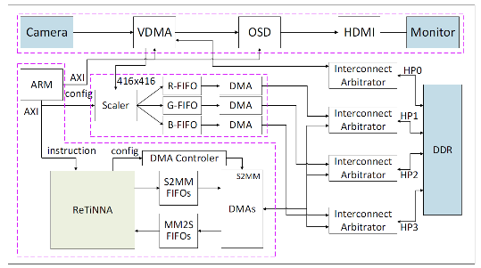 针对现实世界的机器视觉应用中,其他任务(如视频的采集和显示)占用大量带宽使得留给AI加速器的带宽少导致性能下降的问题,作者提出了一种宽带受限条件下的可重构轻量级神经网络加速器(ReTiNNA),并提出了一个高分辨率的实时目标检测系统。在2.23 GB/s的低带宽、90.261K LUTs和448个DSP的低硬件消耗下,ReTiNNA仍然可以在VGG16和ResNet50上实现155.86 GOPS和68.20 GOPS的高性能,比其他在FPGA上实现的最先进的设计更好。此外,实时目标检测系统可以实现19帧/秒的高分辨率目标检测速度。