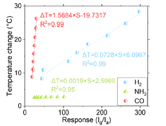 该研究采用基于SnO2纳米片的单一气体传感器,通过同时测量传感器电流与温度变化,将数据映射至二维空间。利用温度变化与气体灵敏度的特定规律,能够快速识别多种还原性气体并准确预测气体浓度,实现了简化气体识别系统复杂性的目标。