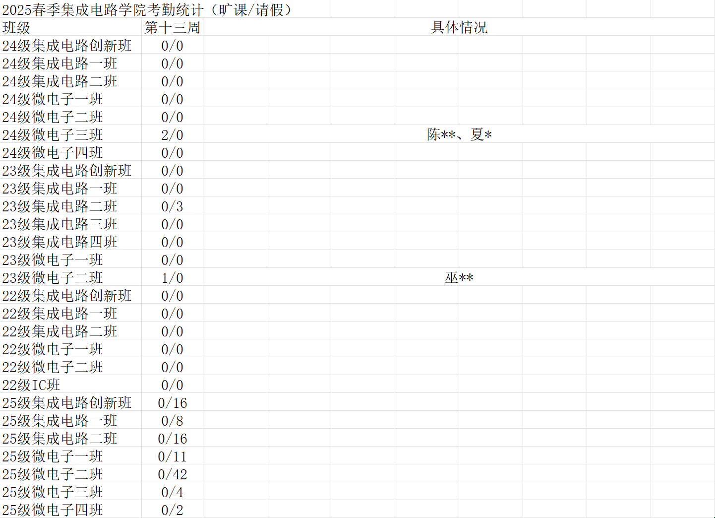 本次统计的是第13周的考勤情况,同学们的积极表现值得肯定和表扬。希望同学们保持良好学习习惯,积极学习。